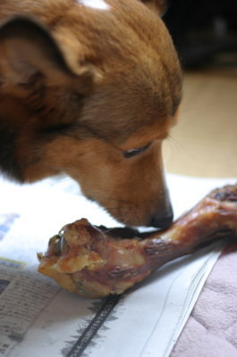 今日はそこそこいいお天気なので、河川敷に行こうかと思ったけど、家からすぐの場所でいっぱい雪遊びがてら走れるので、ま、いいか・・・と今日もご近所のみ。アスファルトの上を全速力ではあまり走らせたくないけど、雪があるとパッドを擦りむく心配もないしね。今日のおやつは買っておいた「ハムボーン」をあげる事にした。大きいものをガツガツと食べなくなってしまったアトム。上手く食べられるかなぁ・・・と思っていたので買った事がなかったんだけど、またまた送料タダを狙ってお買い上げ。(^_^;) 涎でベトベトにならないように、我が家御用達の新聞の上ではいどうぞ。初めて見るハムボーン。最初はクンクン、そしてペロペロ。しばらくはどうやって食べたらいいのかわからずって感じで転がしておりました。そのうちかぶりつこうとするものの、その反動で動いてしまい一向に食べられない。「おててで持って食べたらいいやん」と言ってもわかるはずもなく・・・。少し削いであげると目の色が変わってウマウマの表情。(笑) ほっておいたら、食べたいのに上手く食べられないジレンマからか、ぶるぶる武者震い。(爆) またもや削いであげる・・・。ああ、なんて過保護。(苦笑) でも骨まで削れる訳もないので、勝手に格闘してもらおうと無視していたら、口に咥えてそ〜っとベッドの上に運ぶじゃありませんか! ベッドの上はやめて〜と新聞を持って追いかけ、ベッドの上に新聞をしいたら、腰を据えて格闘。ここが落ち着くみたい。(^_^;) そのうち、恍惚の表情でした〜。(笑) |