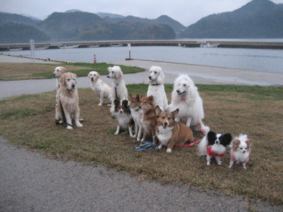 今日はお友達のTOKIKOさんに誘って貰って、無人島で忘年会!に参加してきた。一時は参加出来ないかもなぁ・・・と思ったけど、なんとかごり押しで。(苦笑) TOKIKOさんの訓練所のお友達や丹後のお友達の、人間7人のわんこ13匹。待ち合わせ場所から船で移動。ビビリんのアトムがしがみついてくるので、船で移動中はずっと抱っこ・・・。(>_<) 現地に到着するなりわんこ解放〜♪ ひとっ走りして、まずは食事。お刺身、焼きガニ、カニしゃぶ、ブリしゃぶ、カニのグラタンや牛のたたきや酢の物にカニみそ。そしてカニすきに〆は雑炊。ゆでカニはみんなお持ち帰りでした。残念ながら雨がなかなか止まなかったり、ちょっとアクシデントもあったけど、アトムもいっぱい走ってました。今回、初めましての大型犬も多かったので、大きい子とあまり上手く遊べないアトムなので、大丈夫かな?と思ったけど、問題なくご一緒出来て良かった。美雨ちゃんとも久々に追いかけっこ出来てたしね♪ 帰る時はまだ遊ぶ!の踏ん張りも見られました。(苦笑) 帰りの船も抱っこだったので、腕が早くも筋肉痛だし。(>_<) 帰ってから、夕食の時にお土産のカニを食べました。ご主人もとってもいい方で、なかなかいい所でした。お天気が悪くて写真がほとんどブレブレだったのが非常に残念! |