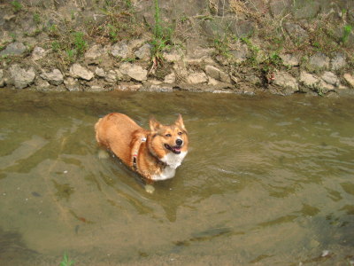 河川敷に行くと、やはり最後は水に入らないと気がすまないようで、段の少ない方でぽちゃ。こっちの方が水がきちゃなそうだったけど・・・。(^_^;) |