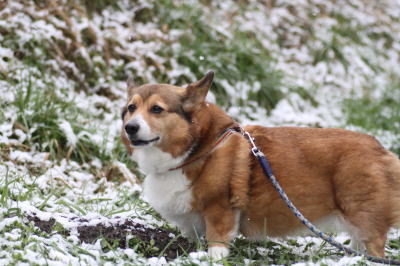 | 3月25日(日) 朝起きて外を見ると雪が降ってる〜。道には積もってないけど、じゃんじゃん雪が降り続く。そんな感じで、アトムは外に出る気マンマンで、私の家事がとりあえず終了するのを待っていた。道に積もってないので遊べないのにね。(苦笑) 結局、夜までほぼ雪が降り続いた。 |