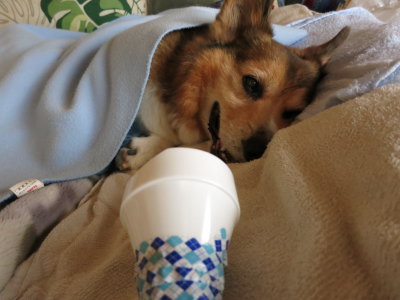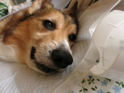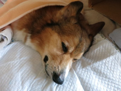 | 1月18日(日) なるべく少しずつ吸水してると、もっと欲しくて要求吠え? もうかすれてしまった声。聞いているだけで辛いし、水が欲しいって言ってるのに聞いて貰えないと思っているかと思うと、それもまた辛い。ほんの少しずつの吸水だけど、2時、4時頃に嘔吐。7時過ぎに排尿を確認しておむつの交換。7時40分頃に空嘔吐。2日以上便は出ていない。口を濡らすのに脱脂綿がいいかと、9時のOPENを待って薬局へ。ついでにとろみを付ける物も買って来た。脱脂綿だと満遍なく濡らせられる。12時過ぎに空嘔吐。午前中は吠えまくってたけど、午後からは目を開けてもすぐに寝てしまう。2時過ぎに何度も嘔吐。でも何も出てこない。5時にも嘔吐。気分が悪くなると吠えて呼んでるような気がするし、台所にいると聞こえないので、今日は晩御飯は旦那に帰りに何か買って来て貰う事にした。夜になってまた吠え始めた。8時頃嘔吐。寝る前にK先生に状態をメール。 #スヤスヤ?お昼寝・・・。 |